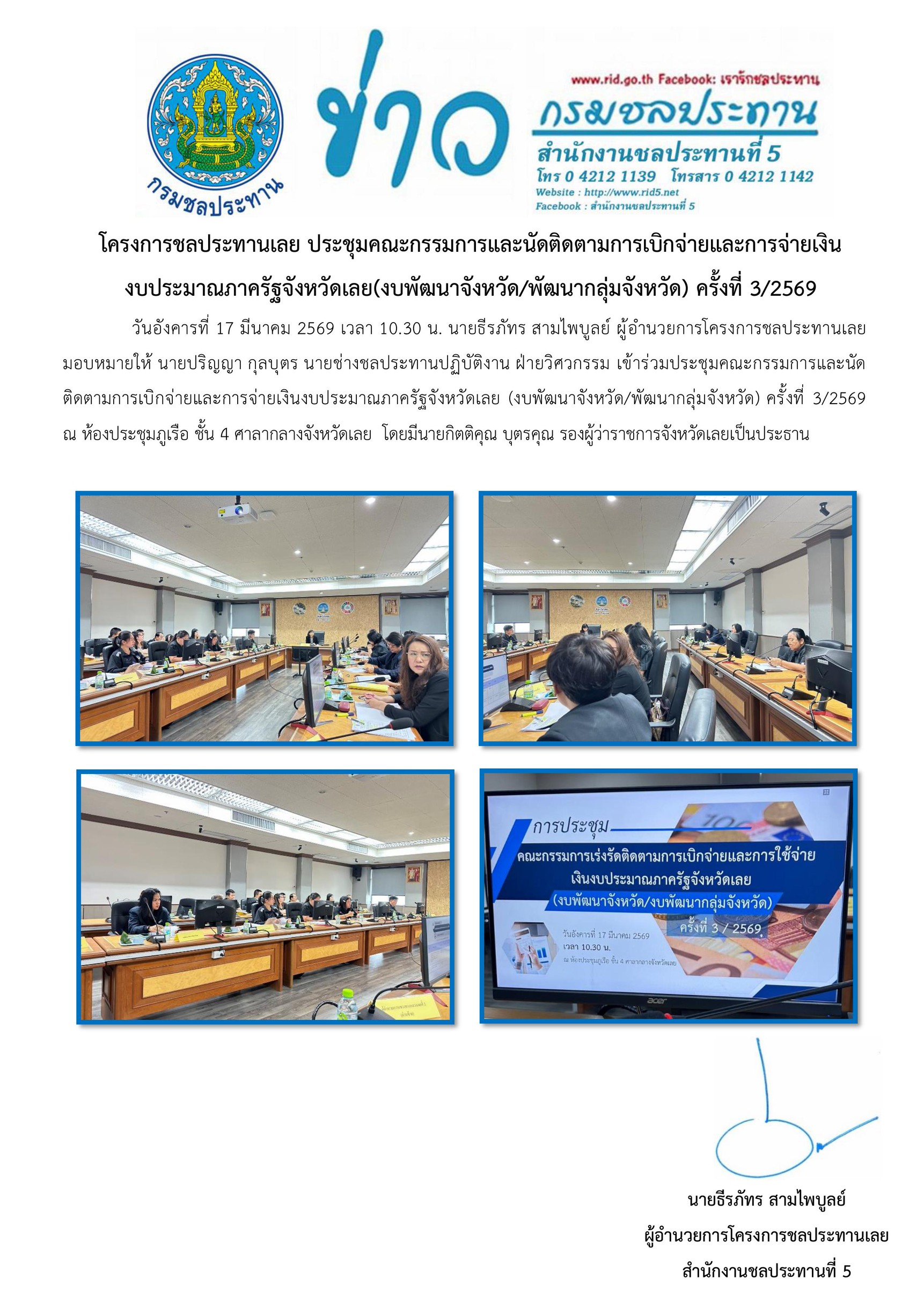 18มี.ค.18 มีนาคม 2026 โครงการชลประทานเลย ประชุมคณะกรรมการและนัดติดตามการเบิกจ่ายและการจ่ายเงินงบประมาณภาครัฐจังหวัดเลย(งบพัฒนาจังหวัด/พัฒนากลุ่มจังหวัด) ครั้งที่ 3/2569 rid5loei@gmail.com2026-03-18T11:35:13+07:00 ข่าวประชาสัมพันธ์