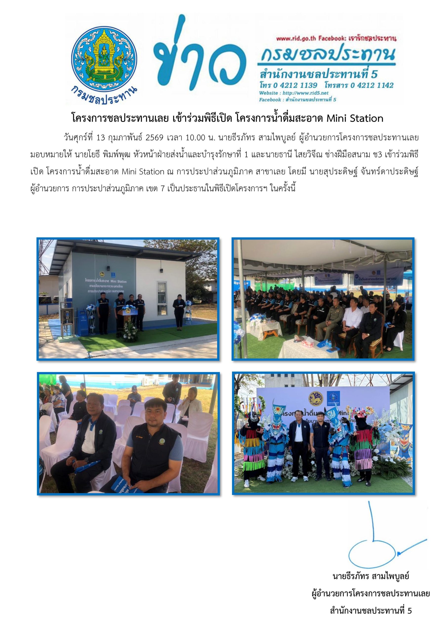 13ก.พ.13 กุมภาพันธ์ 2026 โครงการชลประทานเลย เข้าร่วมพิธีเปิด โครงการน้ำดื่มสะอาด Mini Station rid5loei@gmail.com2026-02-13T13:57:44+07:00 ข่าวประชาสัมพันธ์